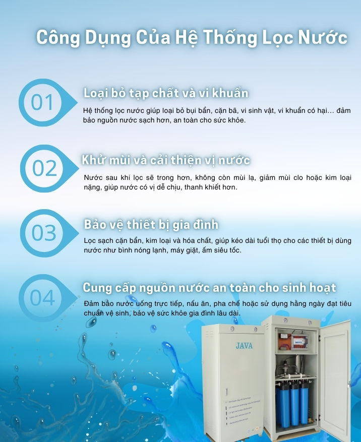 Máy lọc nước Java là giải pháp hiện đại giúp mang đến nguồn nước sạch, an toàn cho sức khỏe của cả gia đình. Với công nghệ lọc tiên tiến đa tầng, Java có khả năng loại bỏ tạp chất, vi khuẩn, kim loại nặng và các chất độc hại thường tồn tại trong nguồn nước sinh hoạt. Nhờ vậy, bạn có thể yên tâm sử dụng cho việc nấu ăn, pha sữa cho trẻ nhỏ hay uống trực tiếp mà không cần đun sôi.